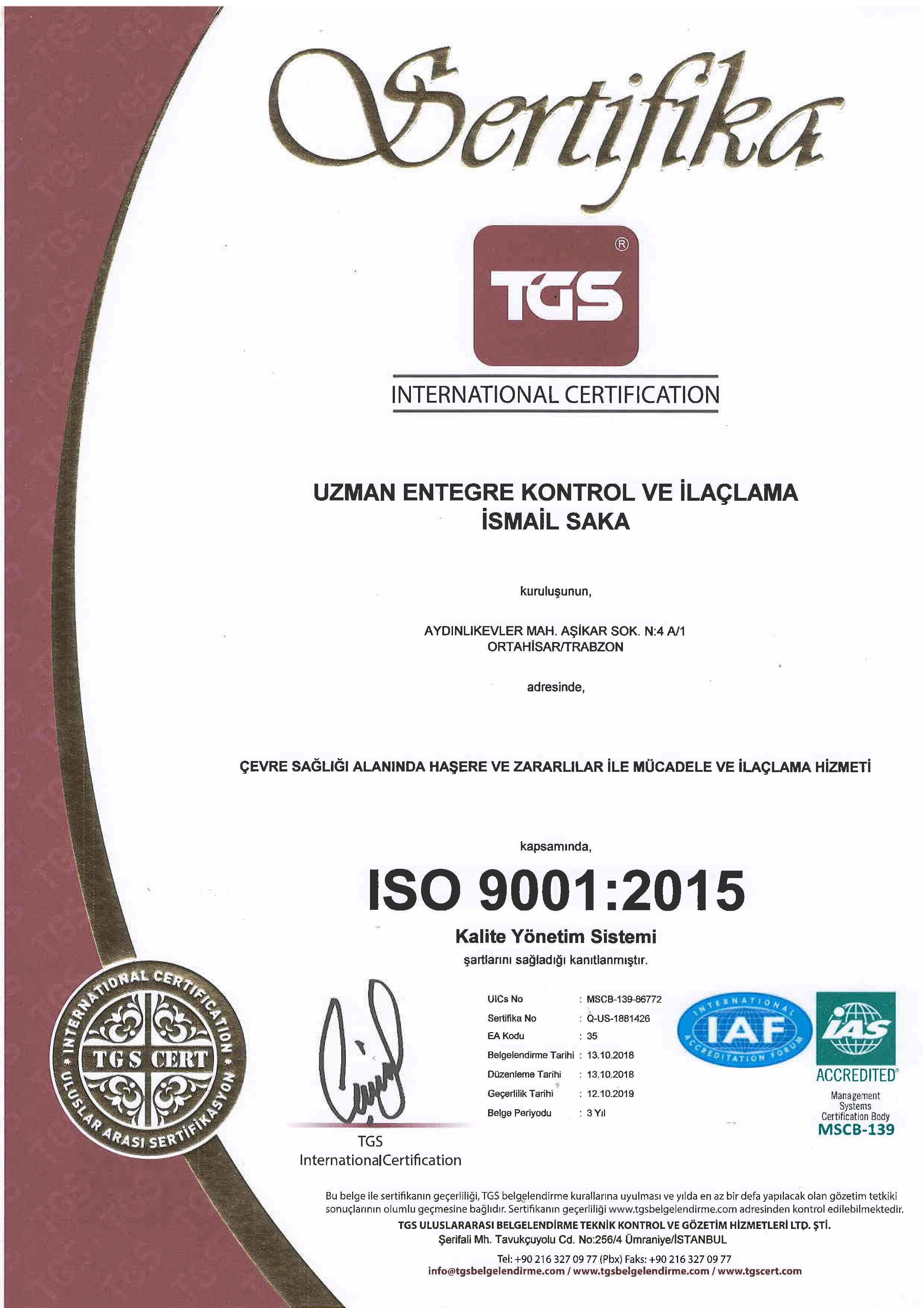 UZMAN ENTEGRE KONTROL VE İLAÇLAMA İSO 9001:2015